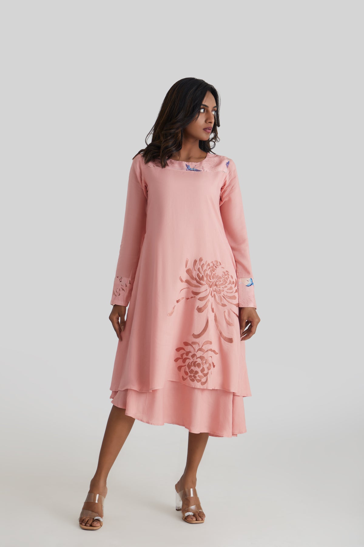 A flowing Viscose Rayon dress featuring a double-layered silhouette, delicate floral embroidery, and subtle bird-print detailing. Designed for effortless elegance with a relaxed, feminine fit.