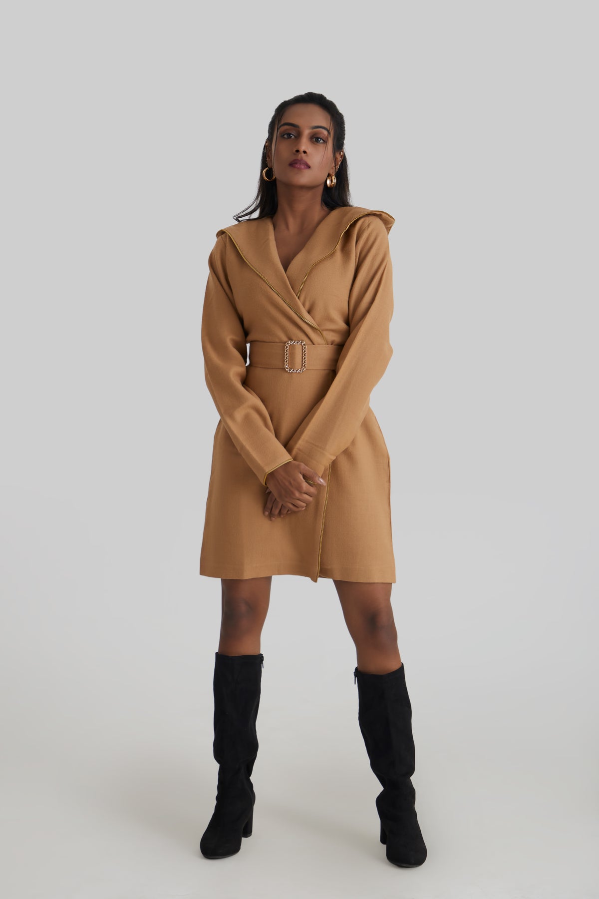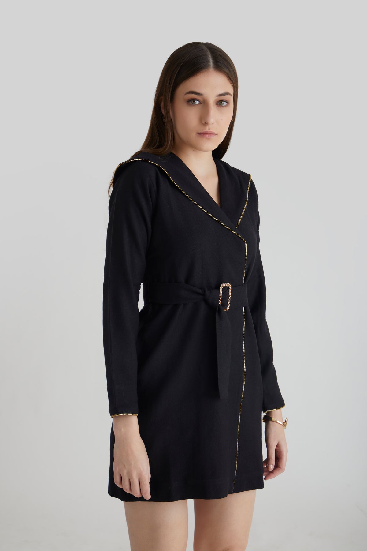 Crafted from 100% premium wool, this wrap-front jacket features contrast gold piping, a belted waist, and a structured silhouette. Refined, warm, and modern—designed for elevated winter styling.